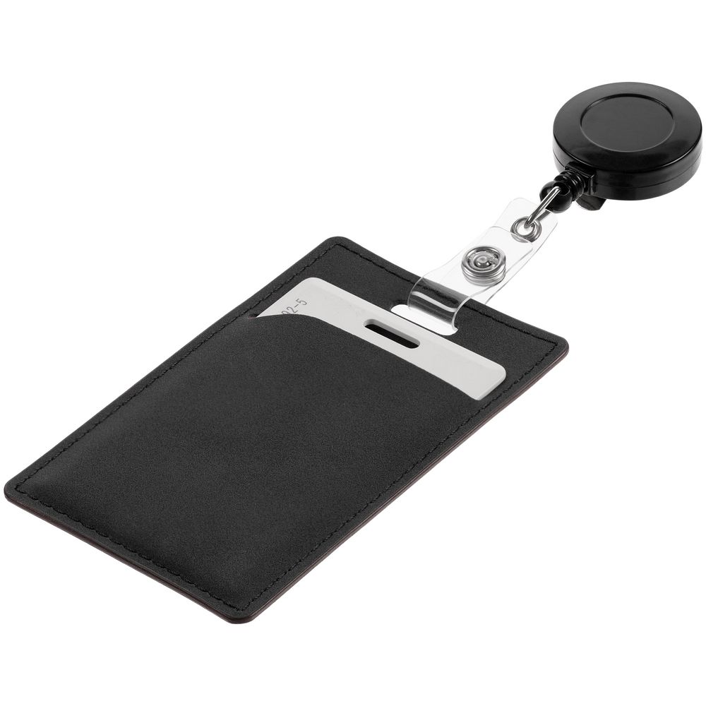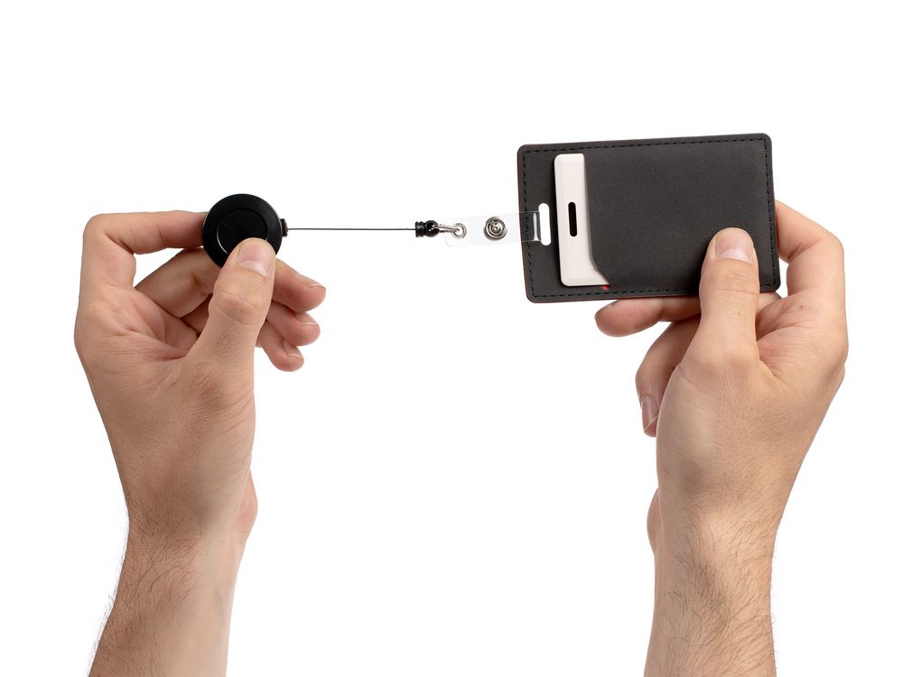 Ретрактор крепится к одежде, а с другой стороны можно поместить бейдж, визитку или магнитную карту. В корпусе спрятан сворачивающийся шнур, который позволяет при необходимости демонстрировать содержимое держателя, не снимая его.