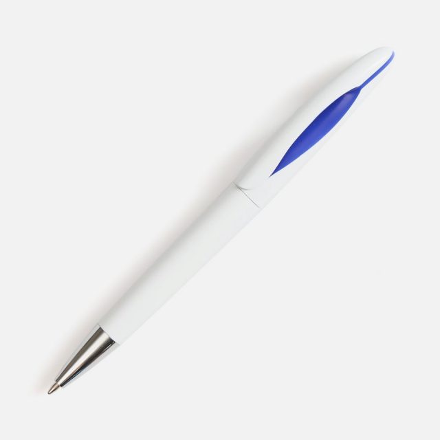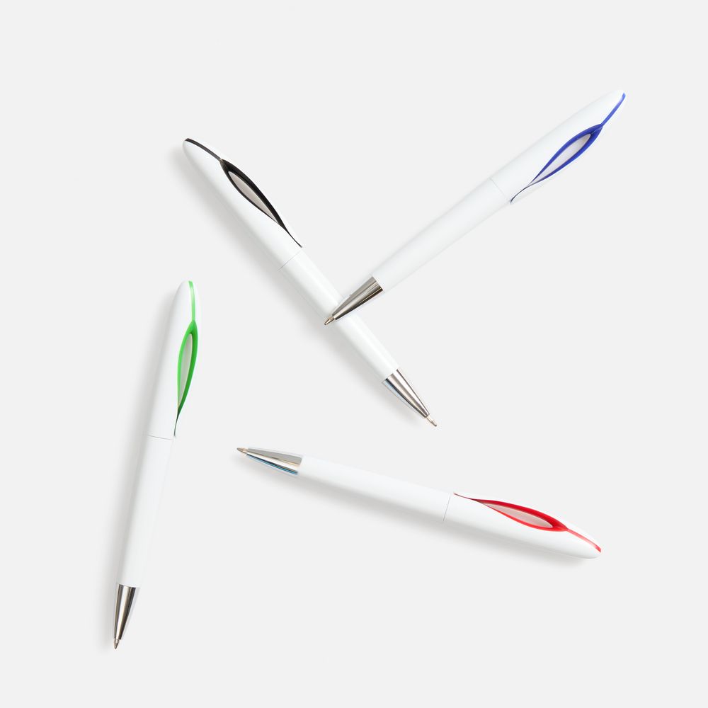 Шариковая ручка приятных округлых форм с белым глянцевым корпусом и цветовым акцентом.