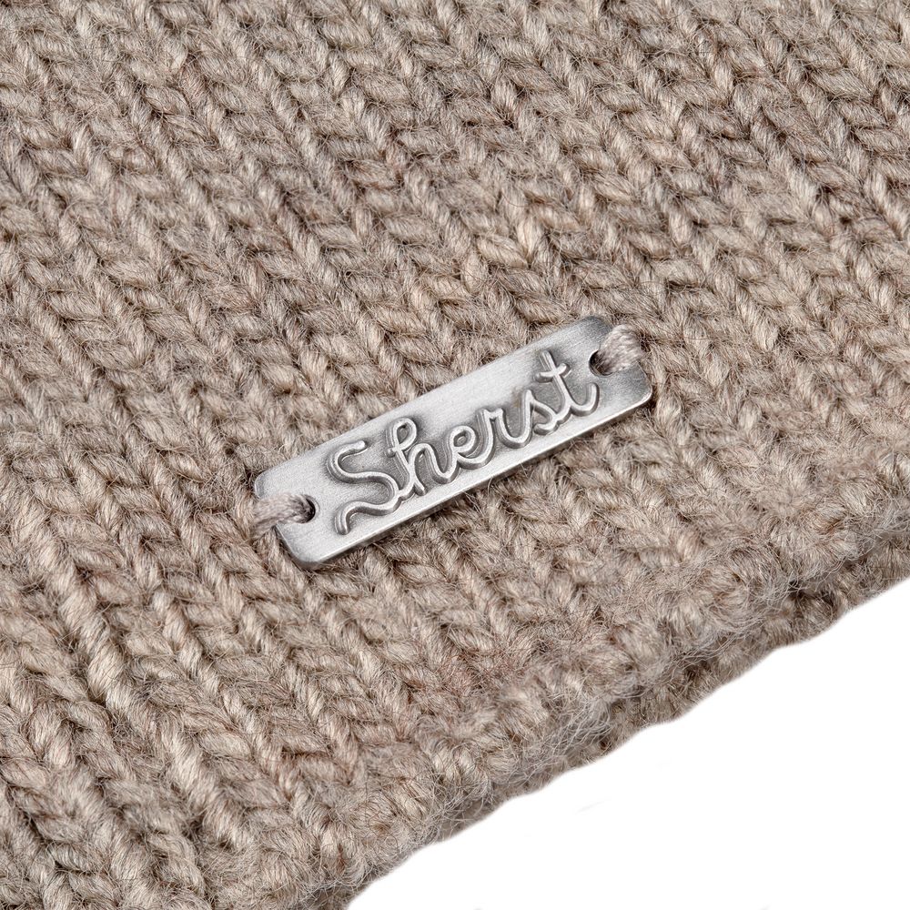 Металлический шильд с названием бренда расположен у заднего шва шапки. Это оставляет место спереди для пришива лейбла или шильдика с логотипом заказчика.
