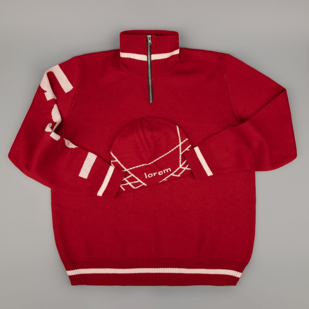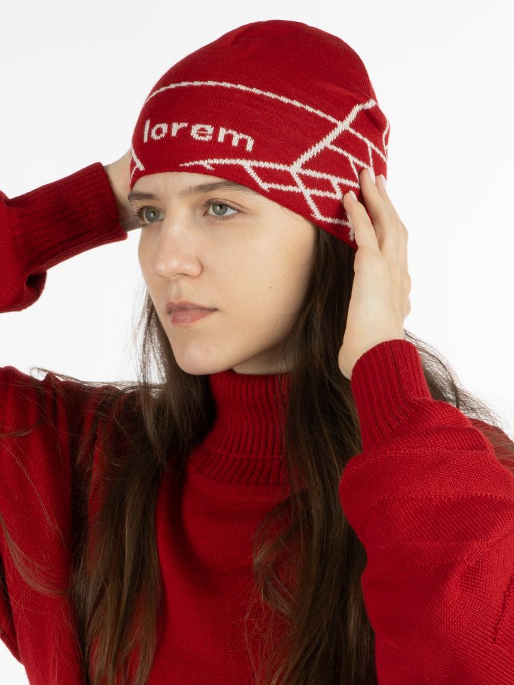 Шапка с вывязанным логотипом и индивидуальным рисунком в фирменной цветовой гамме.