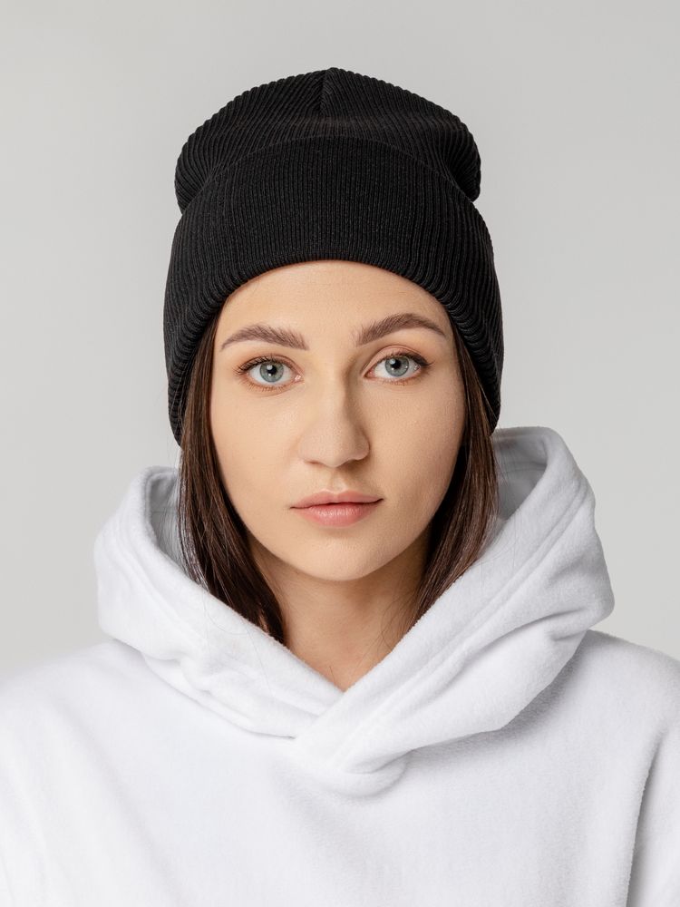 Двухслойная шапка фактурной вязки с отворотом и специальной более гладкой областью под вышивку.