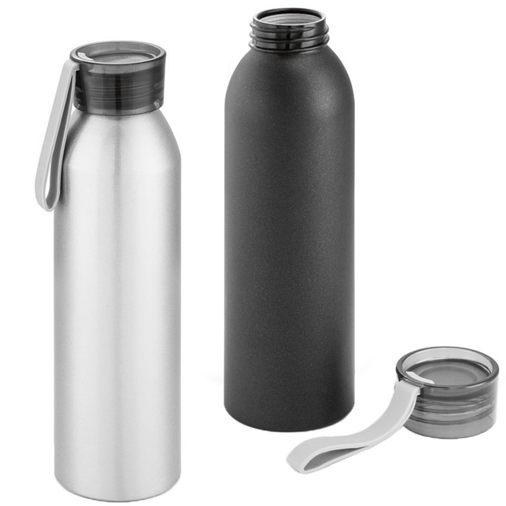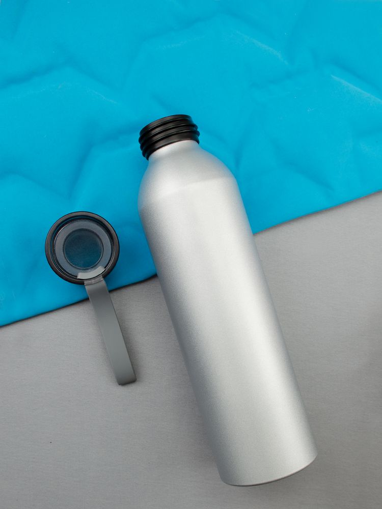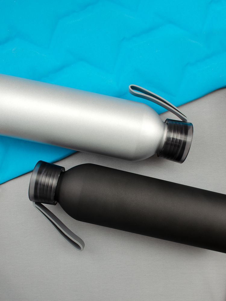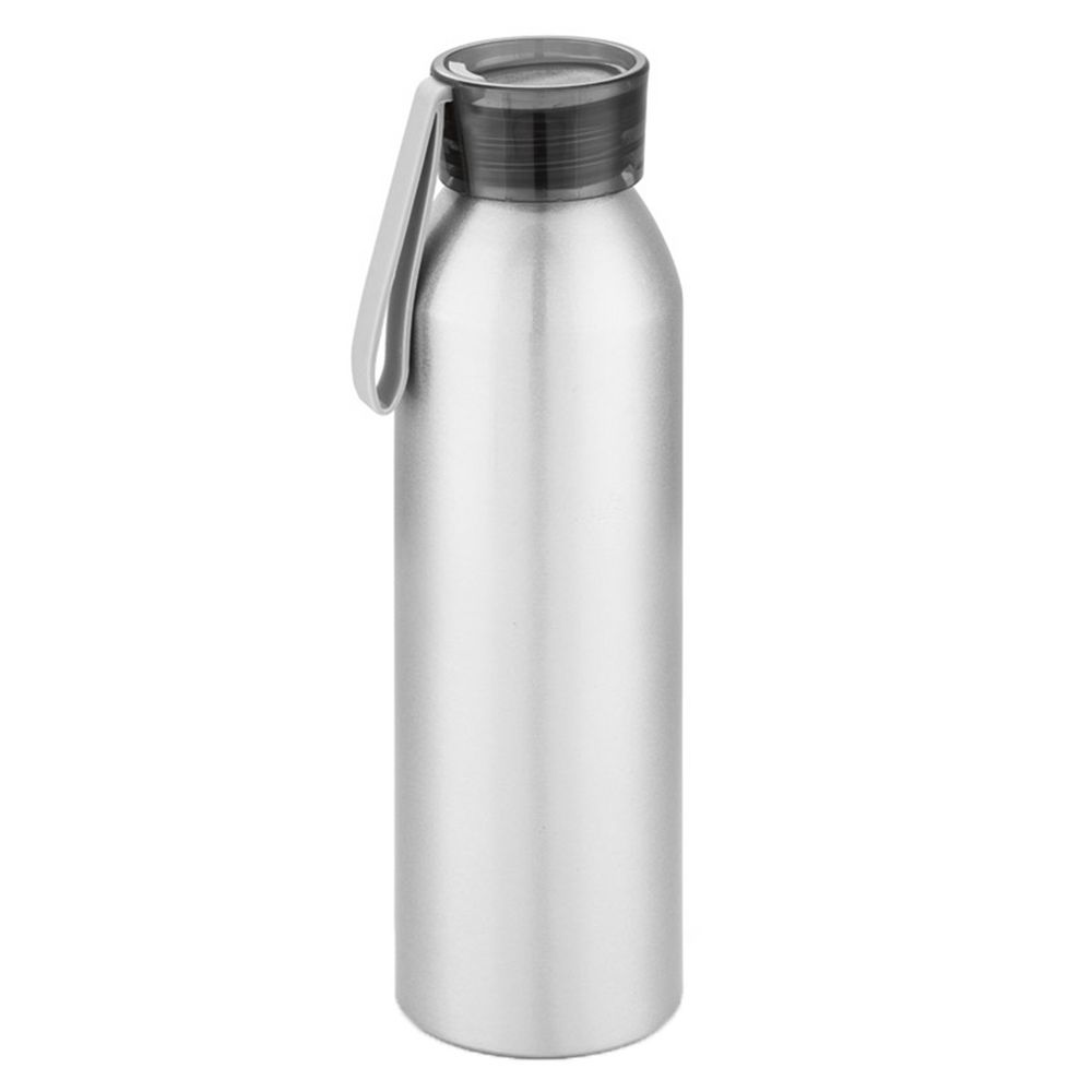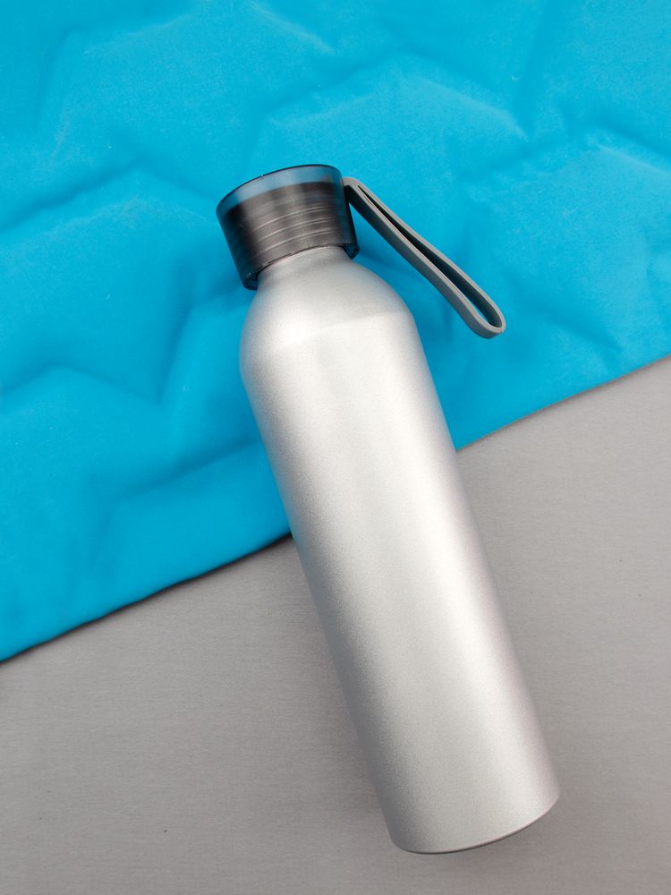 Спортивная бутылка с винтовой крышкой из полипропилена и силиконовой петлей для транспортировки.