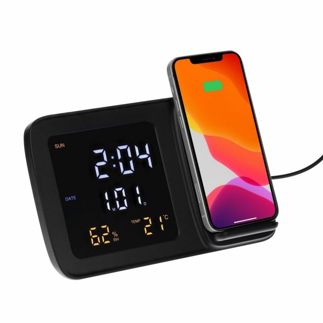Novem — многофункциональное устройство, которое сочетает в себе функции беспроводной зарядки, настольных часов с будильником, электронного календаря и метеостанции, которая показывает значения температуры и влажности.