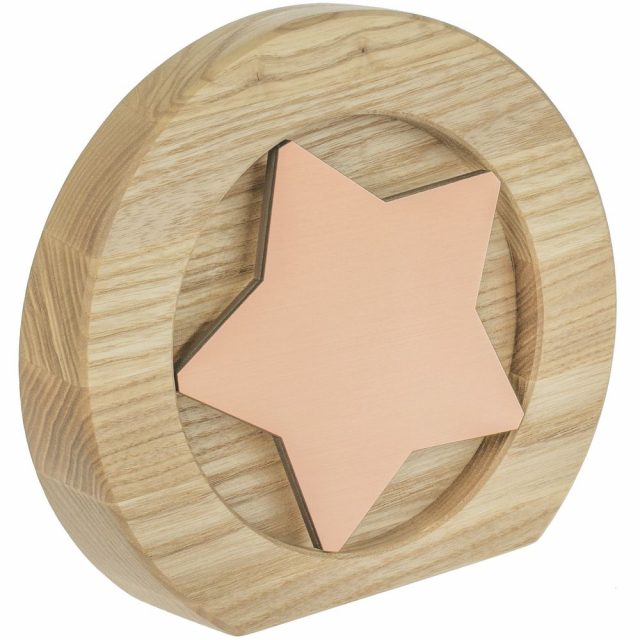 Вставка со звездой из зеркального пластика на деревянной основе крепится на приподнятое основание внутри стелы, что создает объем и многослойность награды. На вставке предусмотрен клеевой слой для крепления после нанесения.