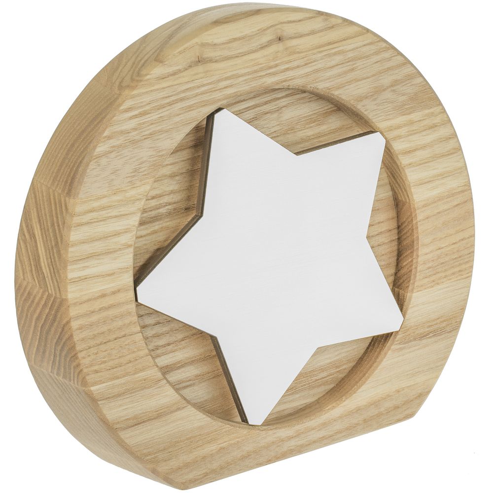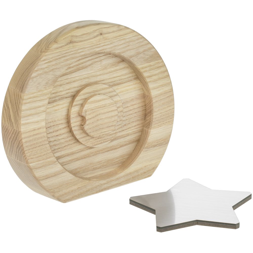 Вставка со звездой из зеркального пластика на деревянной основе крепится на приподнятое основание внутри стелы, что создает объем и многослойность награды. На вставке предусмотрен клеевой слой для крепления после нанесения.