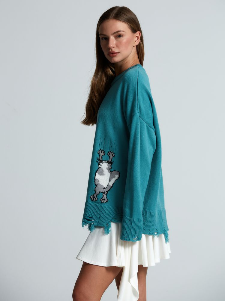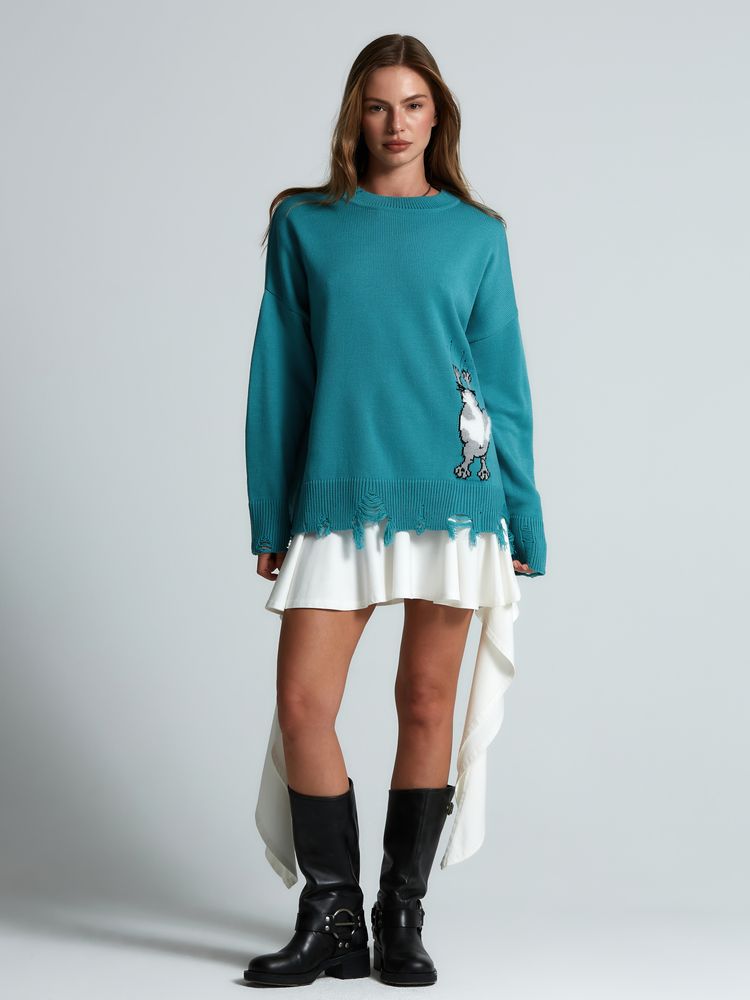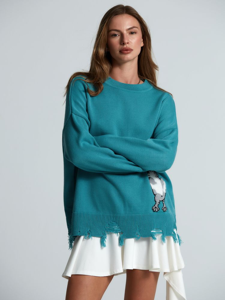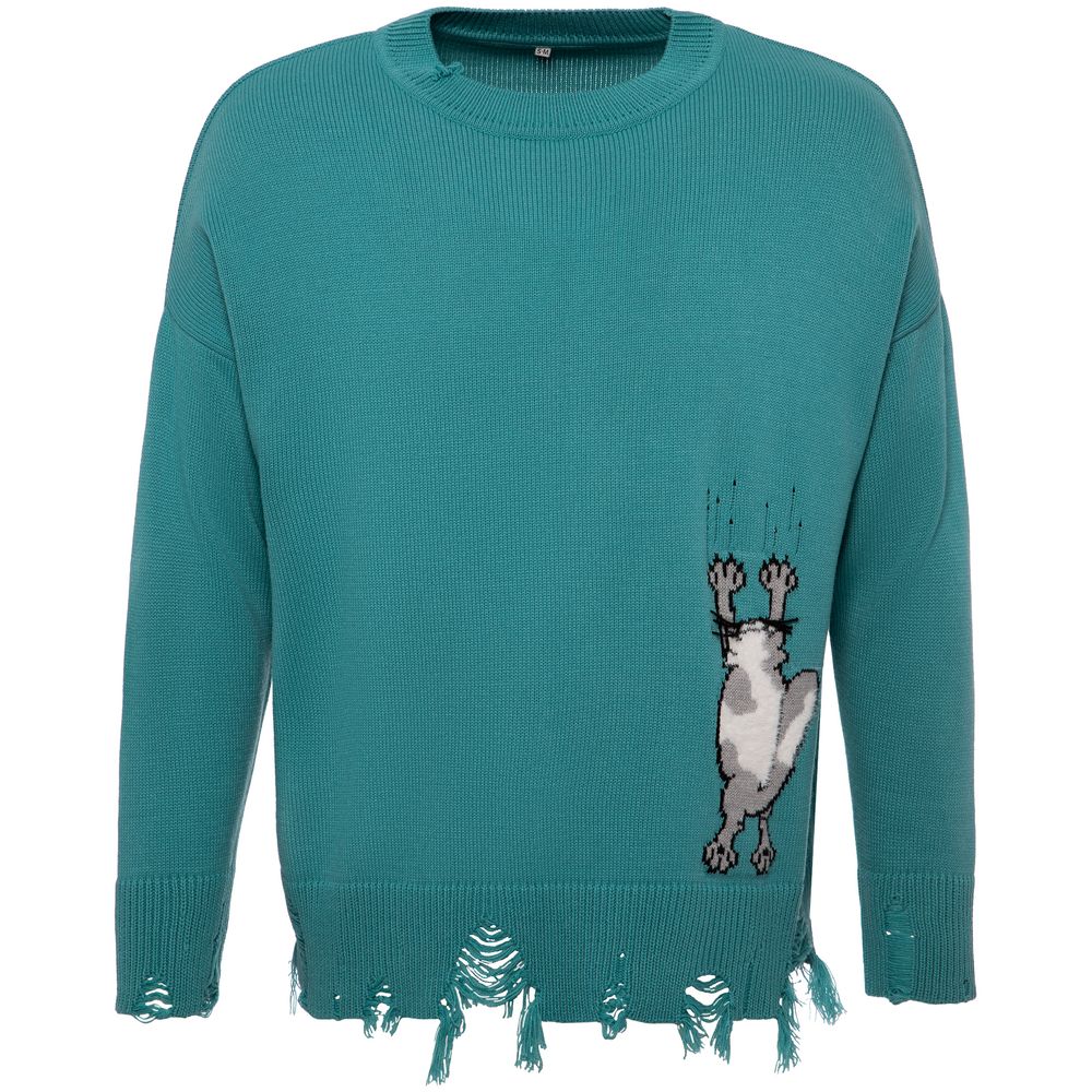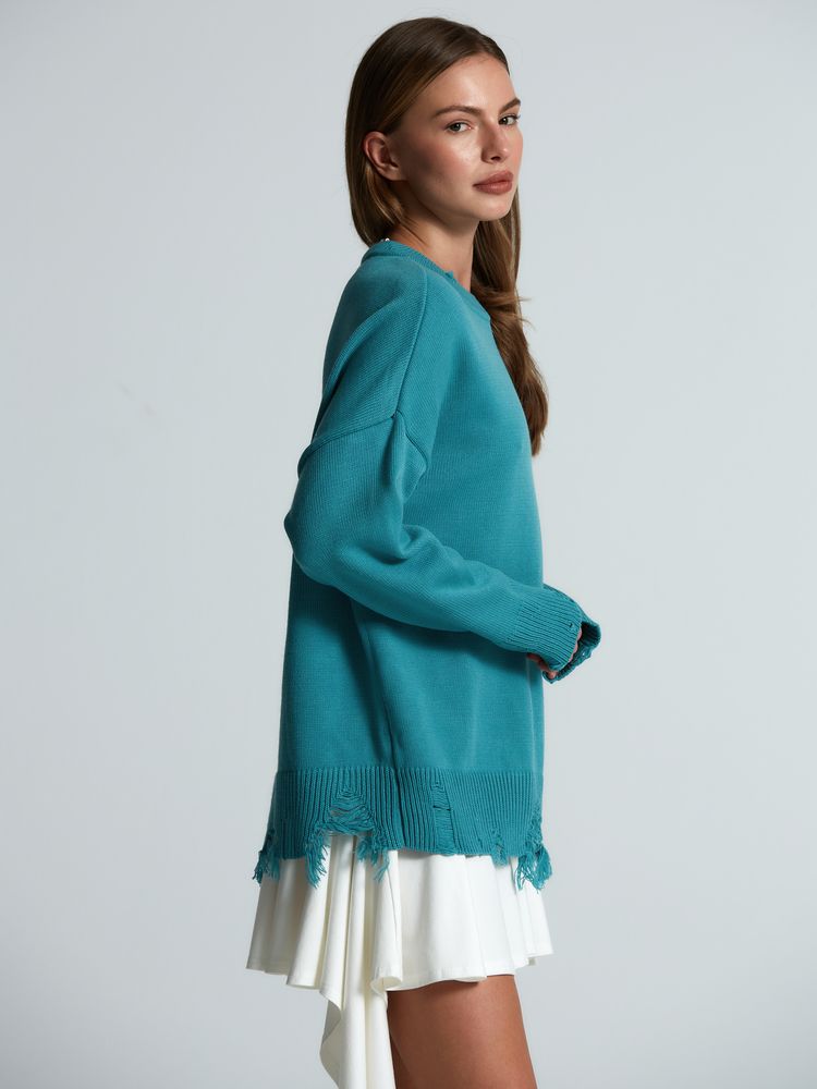 Модель: однотонный гладкий свитер унисекс, спущенное плечо. Ворот, манжеты и низ изделия вывязаны резинкой c добавлением эффекта «рваного» края.