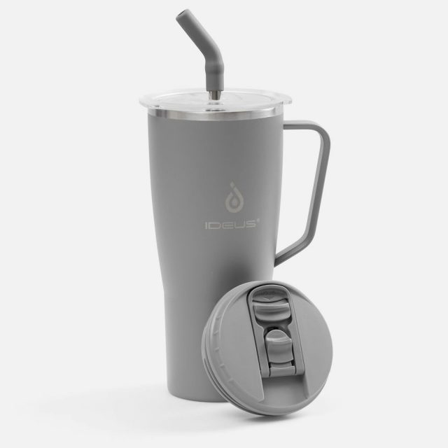 - 2 крышки в комплекте: одна на 100% герметичная с механизмом блокировки отверстия для питья, вторая — с отверстием для трубочки