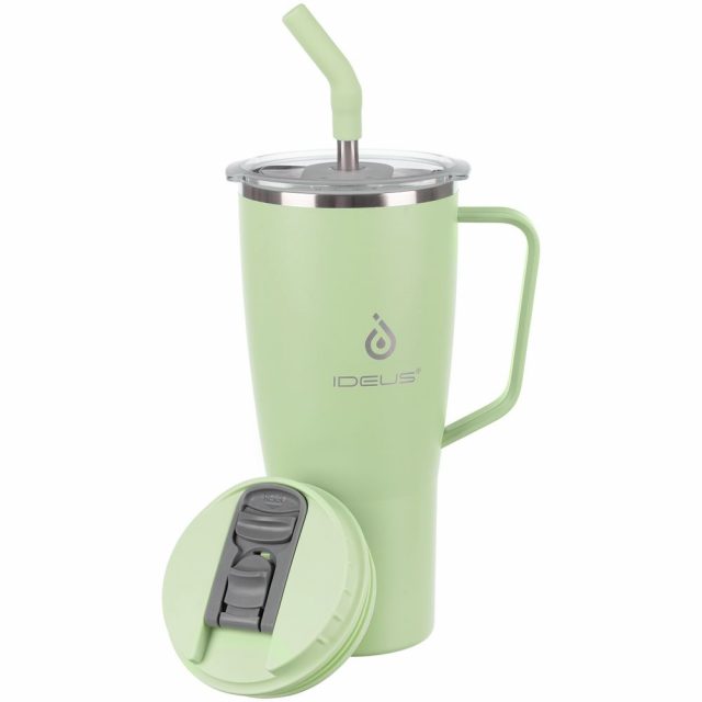 - 2 крышки в комплекте: одна на 100% герметичная с механизмом блокировки отверстия для питья, вторая — с отверстием для трубочки