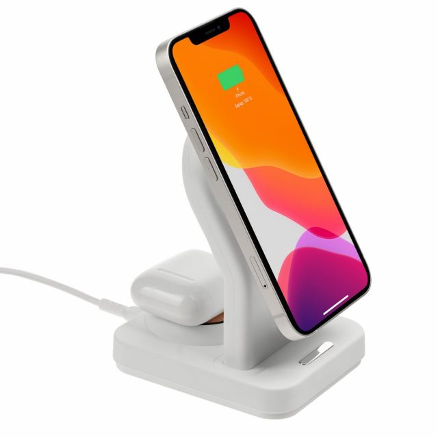iPhone 12–15 c магнитами MagSafe могут удерживаться на основной области станции. Ранние или компактные модели iPhone или смартфоны с диагональю 5,7–6″ на OS Android можно оснастить специальным адаптером Magmate или чехлом со встроенным кольцевым магнитом сзади.