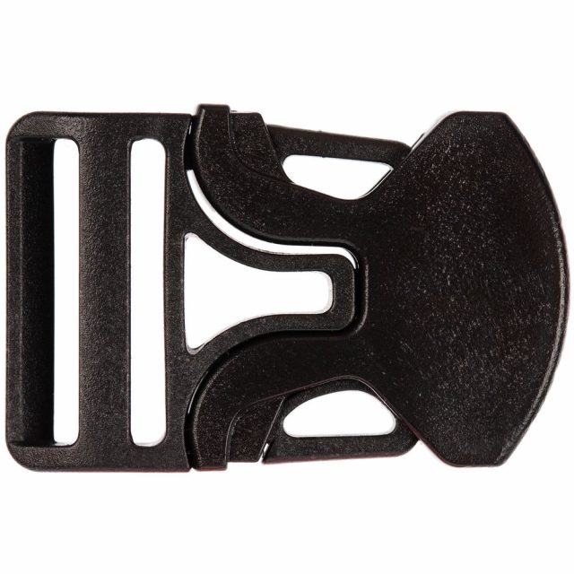 Особенность этой пряжки в том, что она состоит из 3 частей, две из которых крепятся напрямую на изделие, и для их установки необходим специальный инструмент. Третья деталь фиксируется на стропе.