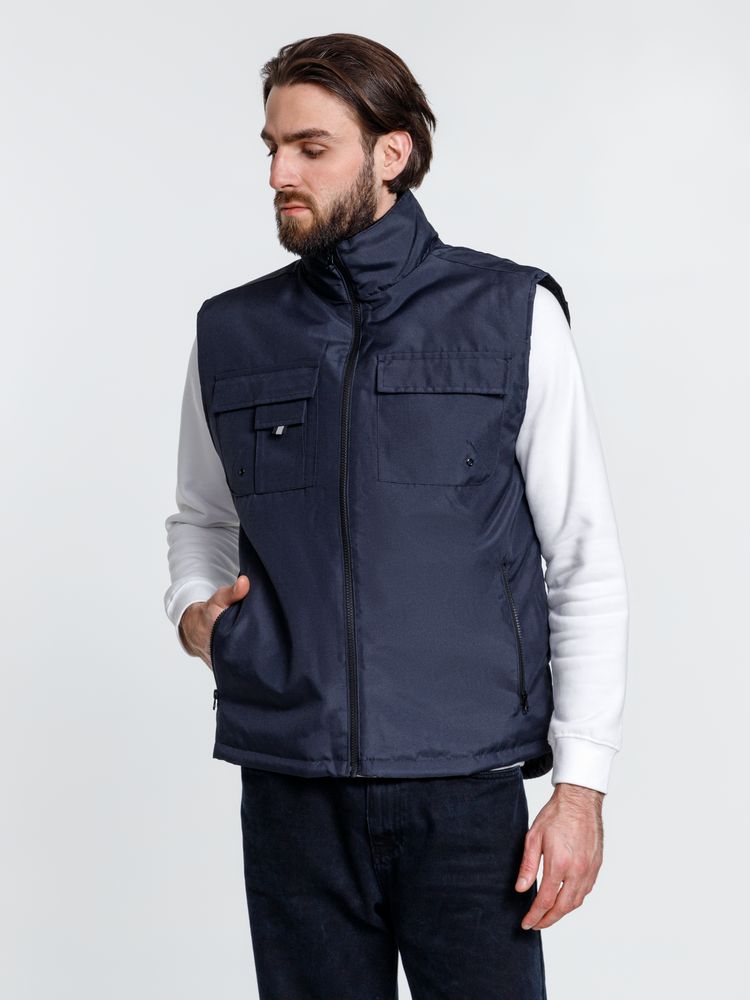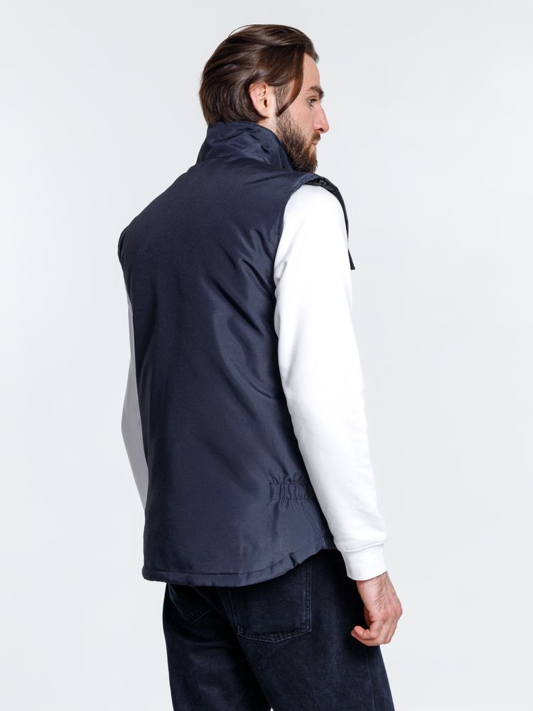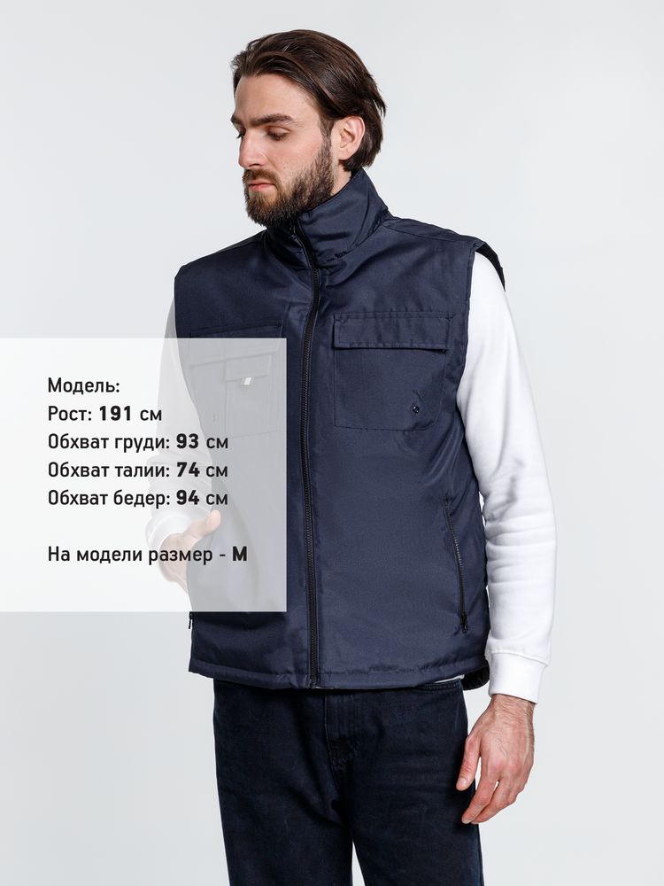 Мужской утепленный жилет с воротником-стойкой и удлиненной спинкой. Выполнен из ткани оксфорд с водоотталкивающим покрытием.