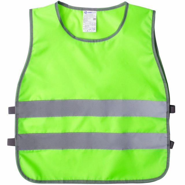 Детский светоотражающий жилет с застежкой-липучкой с одной стороны. Надевается через голову.