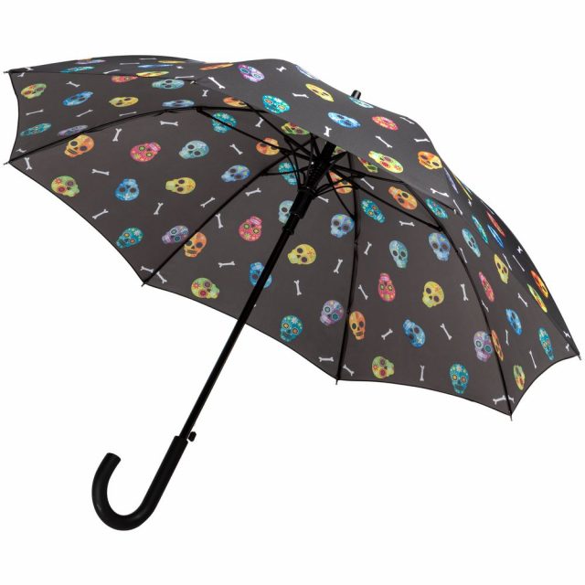 Зонт-трость с веселыми черепами-калаверами — символом мексиканского Дня мертвых — наполнит ваши прогулки под пасмурным небом атмосферой ярчайшего латиноамериканского фестиваля. Дождю не испортить ваш внутренний праздник!Зонт-полуавтомат, 8 спиц.