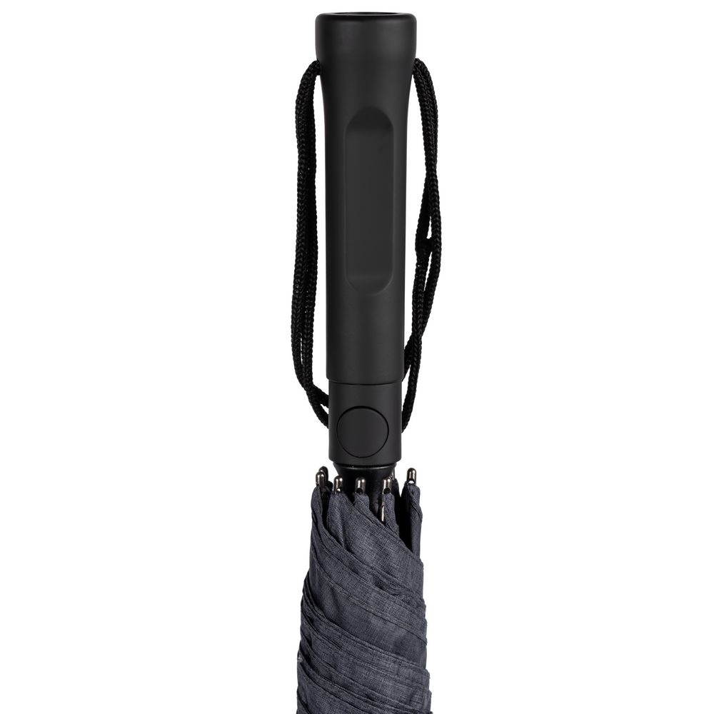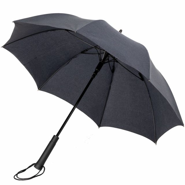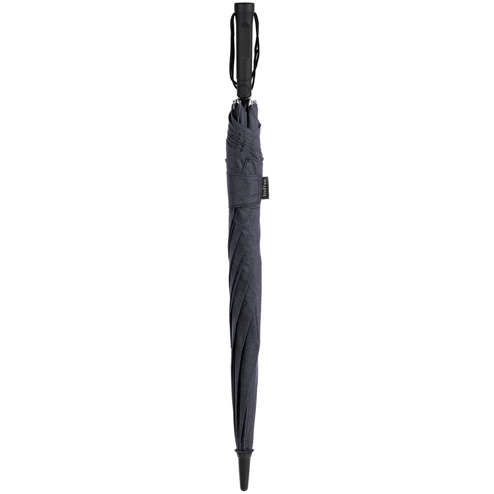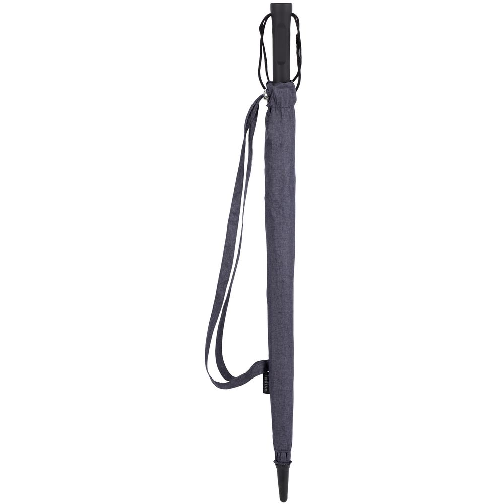 Зонт с куполом из меланжевой ткани уже достаточно необычен, но все еще вписывается в строгий дресс-код. Широкий хлястик трапециевидной формы предлагает достаточно места для нанесения логотипа.
